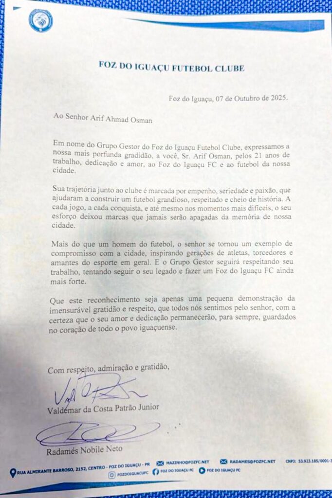 O momento também marca o encerramento de um ciclo importante na história do Azulão da Fronteira: o do agora ex-presidente Arif Ahmad Osman, que dedicou mais de 20 anos de sua vida ao Foz do Iguaçu FC, conduzindo o clube com seriedade, paixão e compromisso com o futebol iguaçuense.